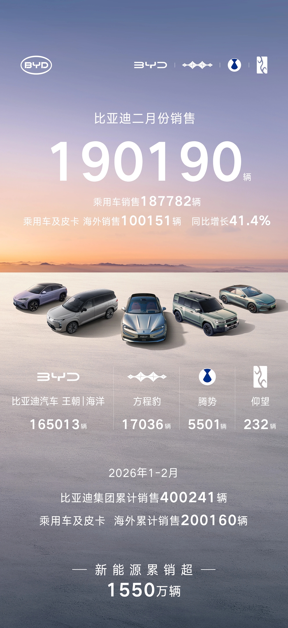 比亚迪2月份销售190190辆,蝉联中国新能源汽车销量冠军