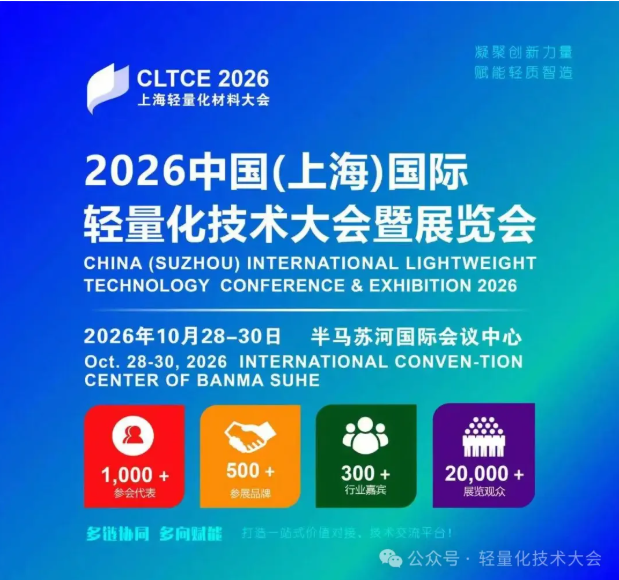CLTCE2026中国(上海)国际轻量化技术大会暨展览会”将于2026年10月28-30日在半马苏河国际会议中心隆重举办!本届大会以 “凝聚创新力量 赋能轻质智造”