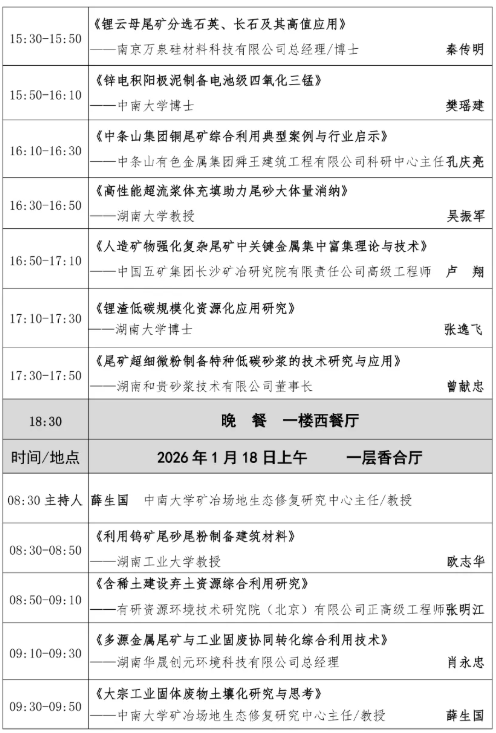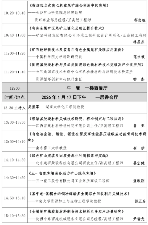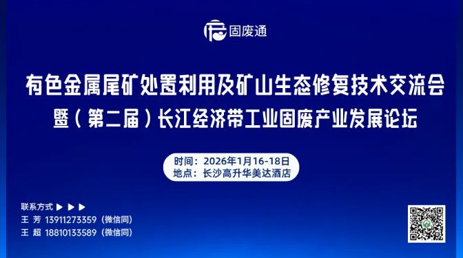 为提升我国有色金属尾矿无害化处置、资源化利用及生态化利用等技术创新水平,精准破解行业难题,推广示范工程成果经验,由工业固废网联合湖南省有色金属产业技术创新战略联盟、湖南省有色金属学会、湖南省矿产资源学会、湖南省循环经济研究会、中南大学矿冶场地生态修复研究中心、国家金属矿山固体废物处理与处置工程技术研究中心、中国机电产品流通协会绿色智能矿山分会、湖南省矿业协会等单位定于2026年1月16-18日在长沙举办“有色金属尾矿处置利用及矿山生态修复技术交流会暨(第二届)长江经济带工业固废产业发展论坛”。现诚邀各相关单位积极组织报名参加。
