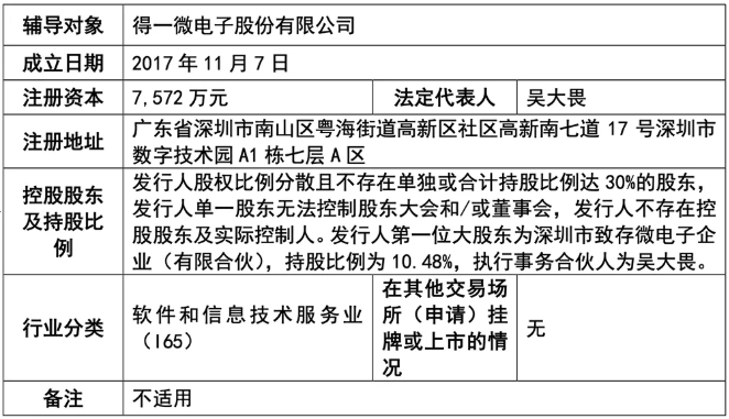 得一微成立于2017年11月,注册资本为7572万元,法定代表人是董事长兼总经理吴大畏,股权比例分散且不存在单独或合计持股比例达30%的股东,不存在控股股东及实际控制人。其第一大股东为深圳市致存微电子企业(有限合伙) ,持股比例为10.48%,执行事务合伙人为吴大畏。