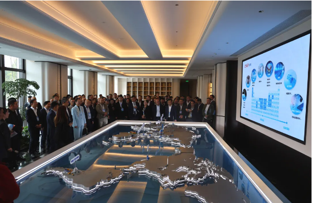 揭牌仪式结束后,与会嘉宾走进中伟邵阳区域总部参观交流。办公楼一楼大厅宽敞明亮,全球沙盘生动呈现着中伟的全球产业布局一一十大产业基地、全球资源网络、遍布五大洲的业务版图一目了然。